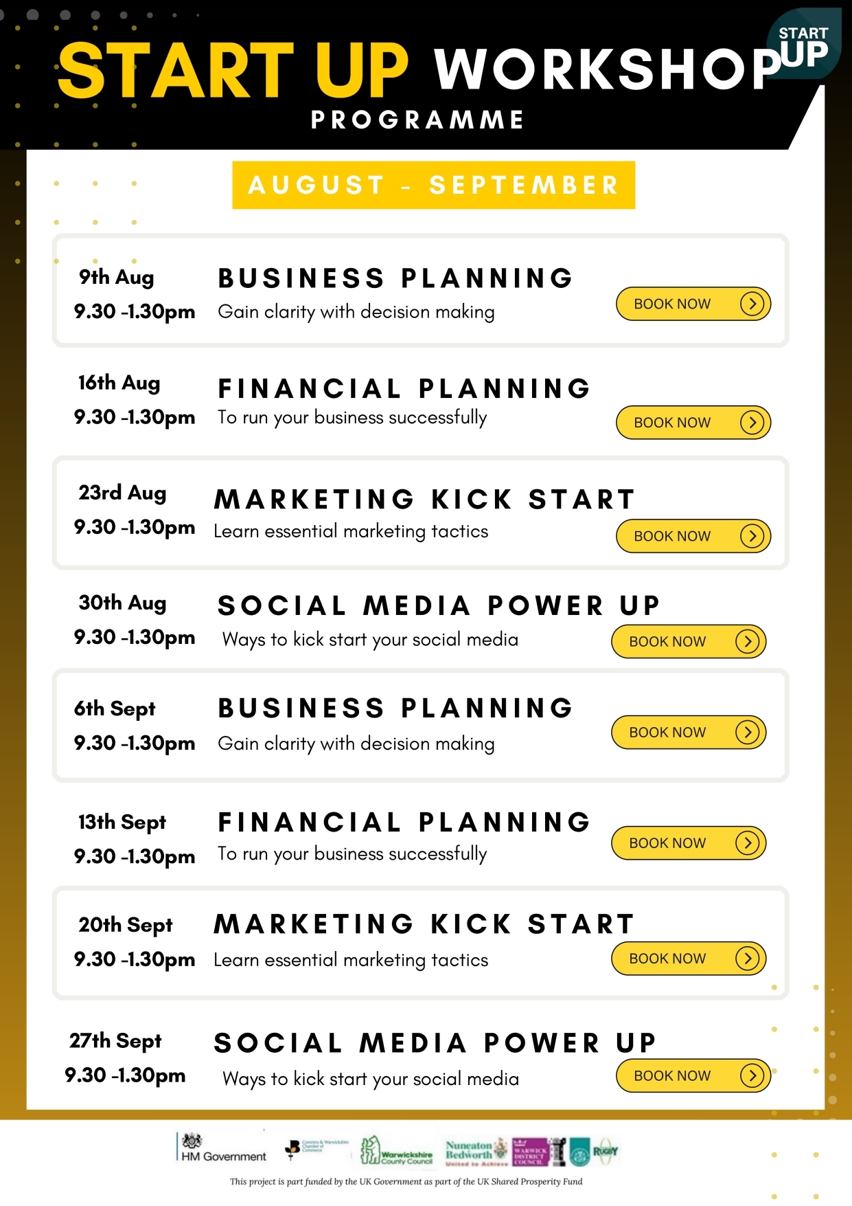 If you wish to enquire into the attendance of any of the above workshops, please visit Coventry and Warwickshire Chamber of Commerce: https://www.cw-chamber.co.uk/business-support/business-start-up/